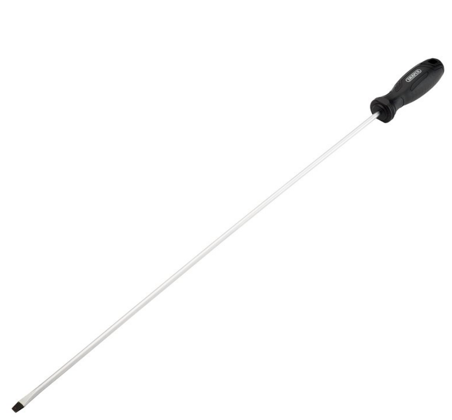 Slotted screwdriver with round blade, chrome plated for corrosion protection.